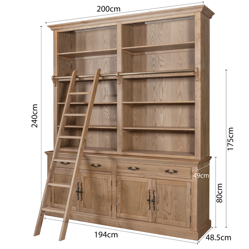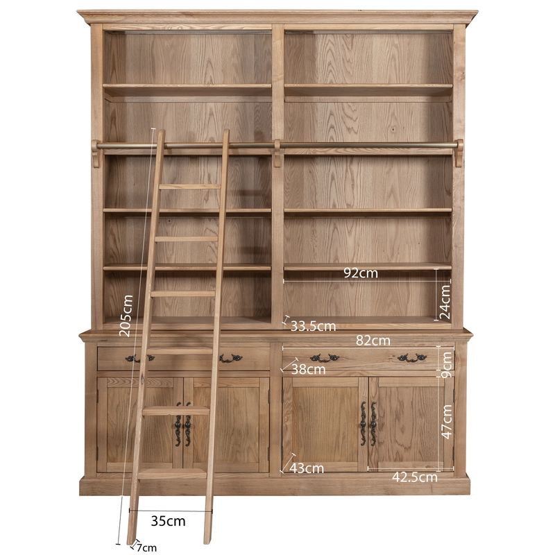 Hamptons Coastal Natural Ash Open Double Buffet and Hutch Bookcase with Ladder